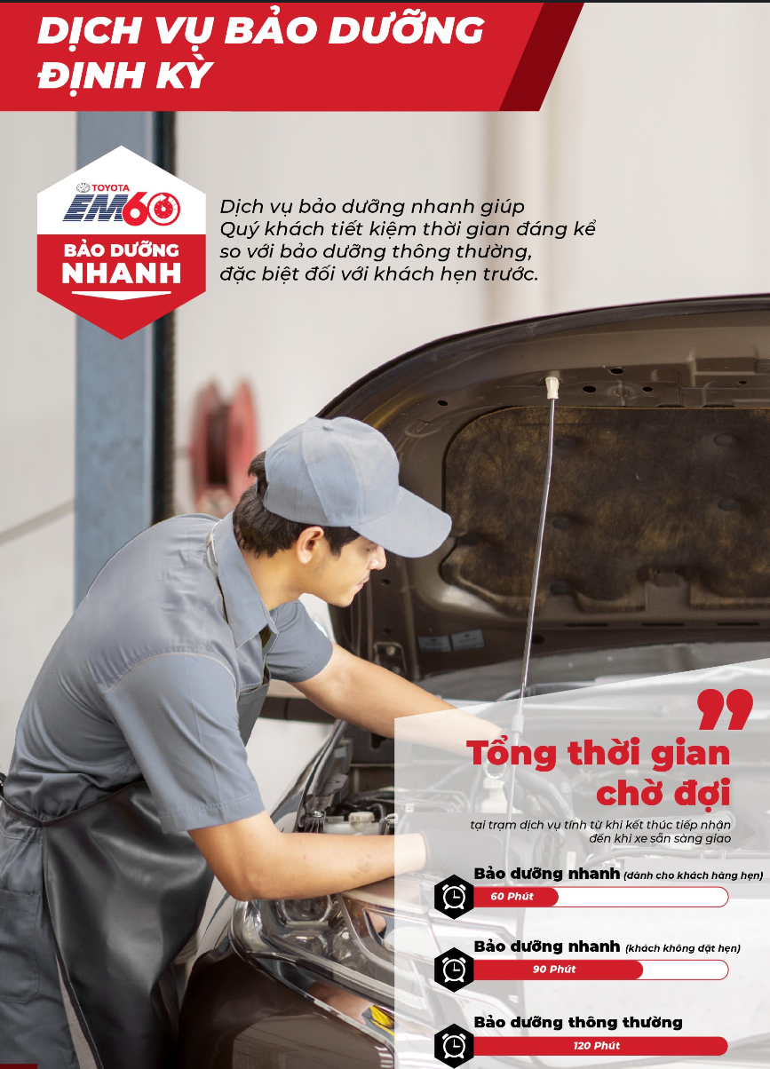 Với trang thiết bị chuyên dụng và quy trình bảo dưỡng 2-3 kỹ thuật viên chuyên nghiệp, Dịch vụ Bảo Dưỡng Nhanh sẽ giúp Quý khách hàng hài lòng hơn khi tổng thời gian chờ đợi tại trạm dịch vụ giảm xuống chỉ còn 60 phút (tính từ khi Quý khách ký lệnh sửa chữa bàn giao xe cho đến khi được thông báo xe sẵn sàng giao), trong khi quy trình bảo dưỡng thông thường mất 2-3 tiếng.